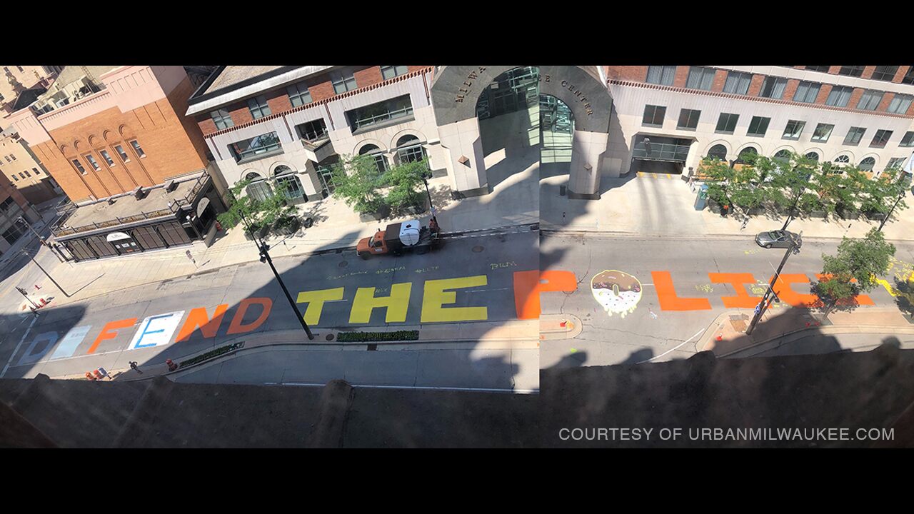 The mural was painted Wednesday to support the nationwide movement to divert funds from police departments toward schools and youth programs. It was later tampered with to spell out “Defend the Police,” with the “D” painted blue, the first “E” covered, and the “U” changed to an “E,” Urban Milwaukee reported.