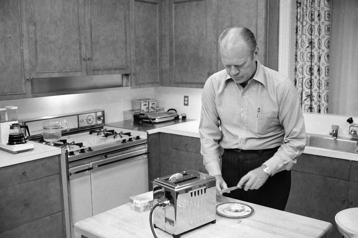 President Ford prepares English muffins, which he toasted in the kitchen of the family quarters at the White House in 1974. Ford, who has always fixed his own breakfast, did not change the habit.