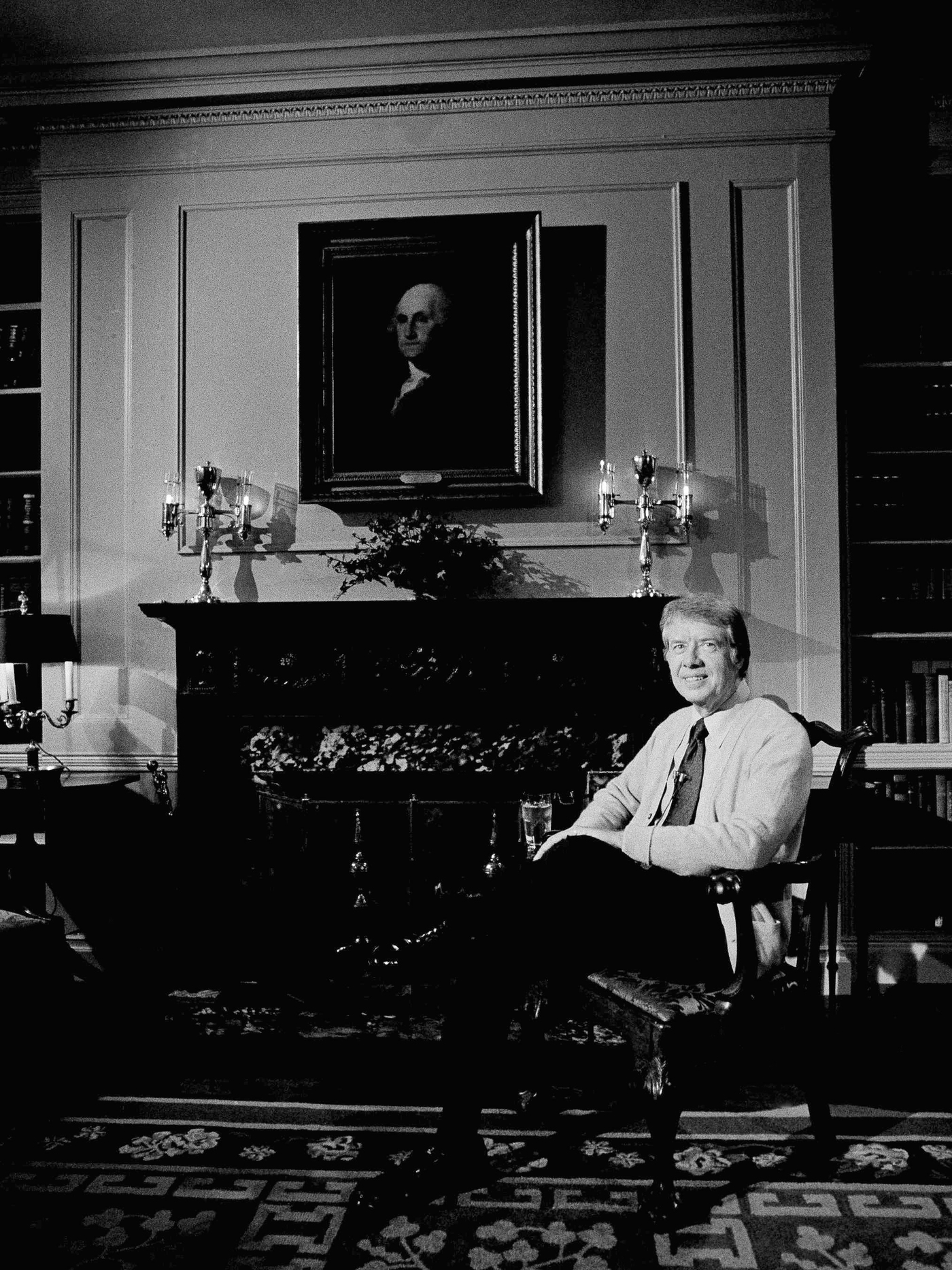 President Carter sits in the library of the White House living quarters in 1977, just prior to air time of a nationally televised “fireside chat.”