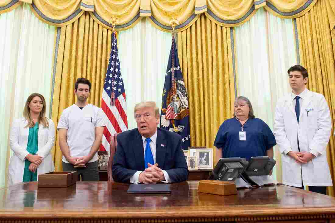 President Trump speaks about COVID-19 alongside nurses after signing a Proclamation in honor of National Nurses Day in the Oval Office of the White House on Wednesday. Trump and Vice President Pence have not worn face masks during public events, which goes against the administration’s recommendations.