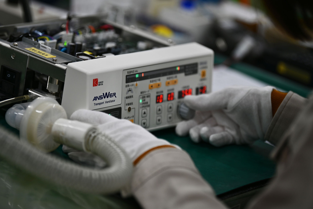 A worker checks transportation ventilators at the end of the production process.