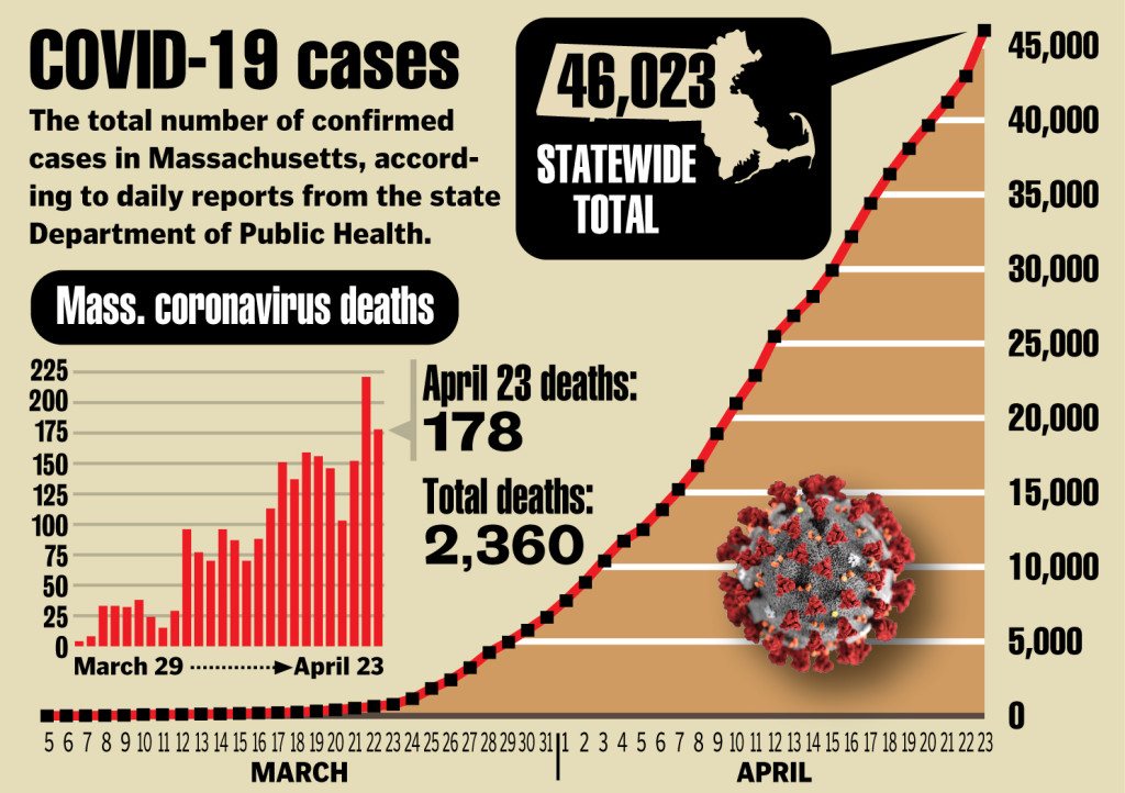 The state now has 46,023 confirmed cases of the highly contagious disease, an increase of 3,079 cases since Wednesday. More than 3,000 cases is a one-day high for Massachusetts.