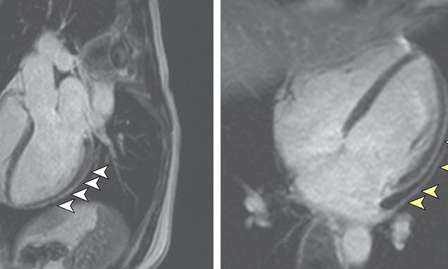 Arrows point out areas of the hearts of coronavirus survivors that became thicker and inflamed after infection. The study found blood markers in these survivors typically only seen after someone sufferers