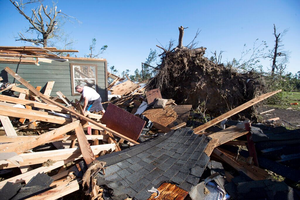 David Maynard sifts through the rubble searching for his wallet, Thursday, April 23, 2020 in Onalaska, Texas, after a tornado destroyed his home the night before. Maynard was inside his home when a tornado devastated the area.