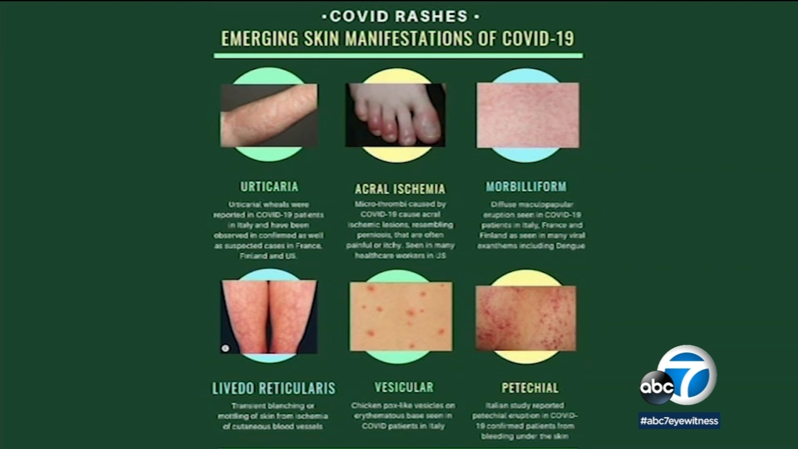 LOS ANGELES, California — Certain skin rashes are emerging as possible symptoms of COVID-19, prompting additional research by some doctors and guidance by the American Academy of Dermatology.