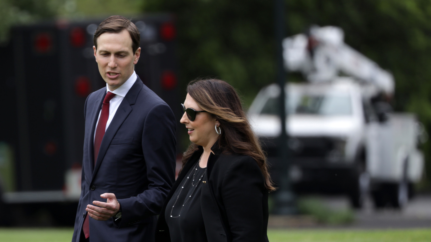 Republican National Committee Chair Ronna McDaniel walks with White House senior adviser Jared Kushner on the South Lawn of the White House in May. She is describing the August convention as a “convention celebration.”