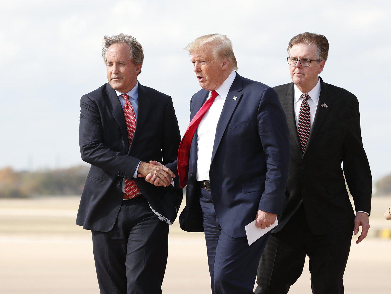 Donald Trump greets Texas Attorney General Ken Paxton (left) as Lt. Gov. Dan Patrick follows at Austin Bergstrom International Airport in 2019. Paxton recently blasted several coronavirus restrictions in San