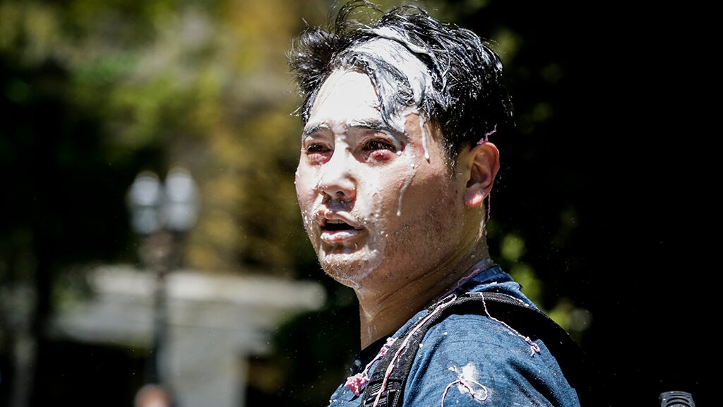 “Punches just came from every direction. And they were striking me repeatedly in the eyes, the back of the head and the top,” he recalled. “I put up my arms at one point just to shield myself and to let them know that I am not a combatant. And then the crowd threw eggs and milkshakes at my face.”